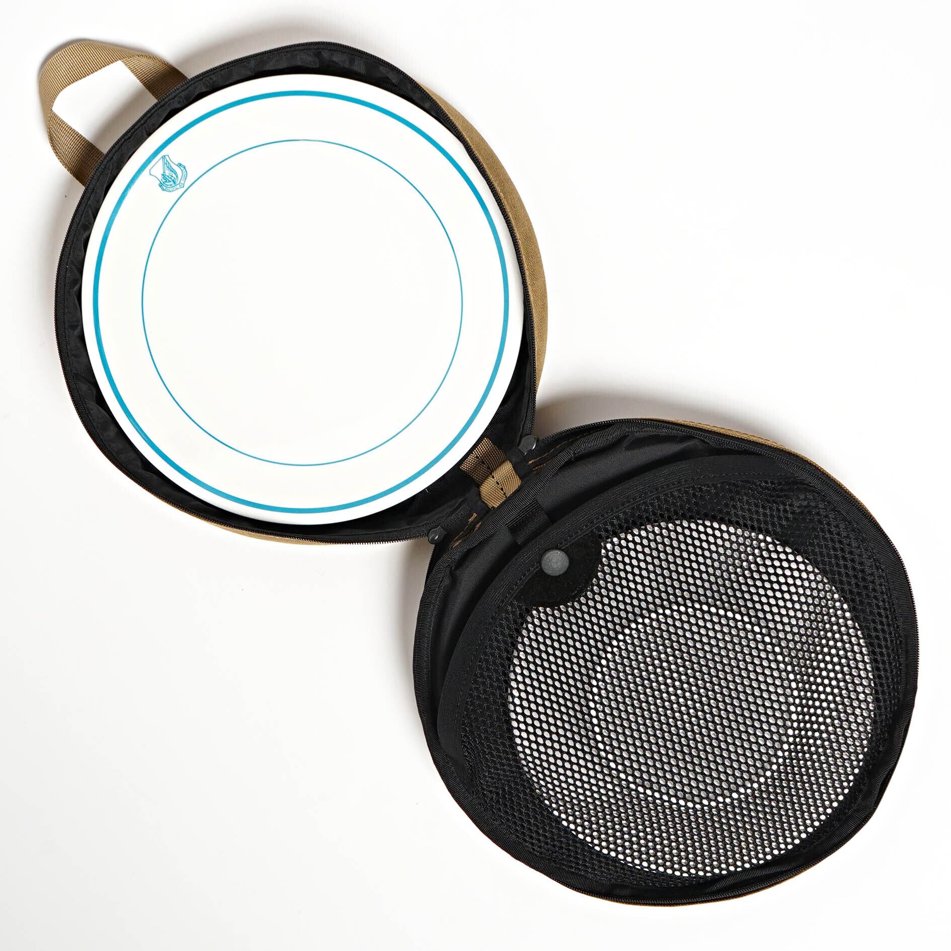 内部のメッシュポケットを間仕切りとして大小のお皿を分けて収納いただけます。